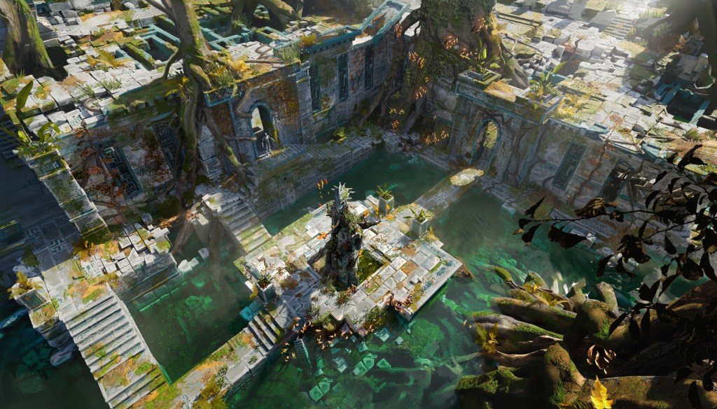 Here’s a paint-over of a level we are working on, adding a lot of decay and vegetation to the ruins. The environment was starting to look a little too bright and happy for our liking and I think this latest piece adds some much-needed darkness and texture.
